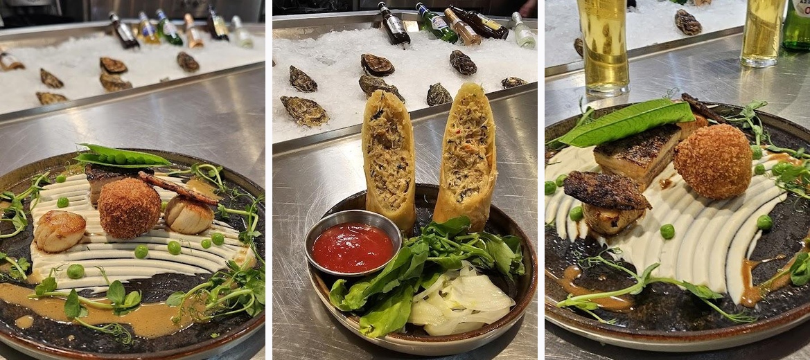Whilst on a short trip to Sunny Donny. We couldn't leave without trying out the newly re-opened dining spot. Located in the Fish Market,where else? On arrival, the place was heaving with eager diners sitting on the stools whilst watching the chef's busy preparing their orders. We were a bit apprehensive as we had our doggies with us.But having been advised, they are most welcome to sit with us,we were shown to the last two seats available. Once seated, we were handed a one page menu, and the very friendly staff mentioned there's a specials board on the wall. In front of you, there's Oysters galore in their shell,sitting on a bed of ice, keeping them so fresh. They were disappearing before our eyes,as people were ordering them left right and centre. If you like your seafood,you are spoilt for choice. From the main menu, we ordered the crab spring roll, served with a watercress, and a lovely spiced jam to dip the two halfs in. The three King Prawns were massive. Served with the tails on, in a spicy chilli marinade finished in butter,cilantro. These were amazing,and we could have eaten them all day. Off the specials board, we ordered the scallops with pork belly,fresh peas,celeriac, and pork scratchings. It was an unsual combination but still delicious. Then there was the Crab and king prawn bisque. Made with courvoisier brandy & double cream served with just the right enough French bread slices. We could have stayed the whole day and gone through most of the menu,but our doggies were getting bored and drooling over the food as much as us. We are so glad we stopped by,it's well worth a visit.